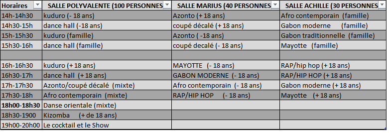 - Cours de danse par séance de 30 min sur cinq registres : Afro, Antilles, Oriental, Contemporain, Monde.